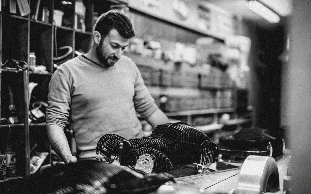Ses sculptures sont constituées d’une succession de couches métalliques qui, ensemble, révèlent une forme iconique – souvent des voitures classiques ou des figures humaines. De loin, elles paraissent solides et reconnaissables, mais à mesure que le spectateur se déplace, se crée un jeu de vide et de masse, une pulsation visuelle qui évoque l’art cinétique. Le résultat est une sculpture en perpétuelle transformation, comme si l’objet respirait, accélérait ou ralentissait.