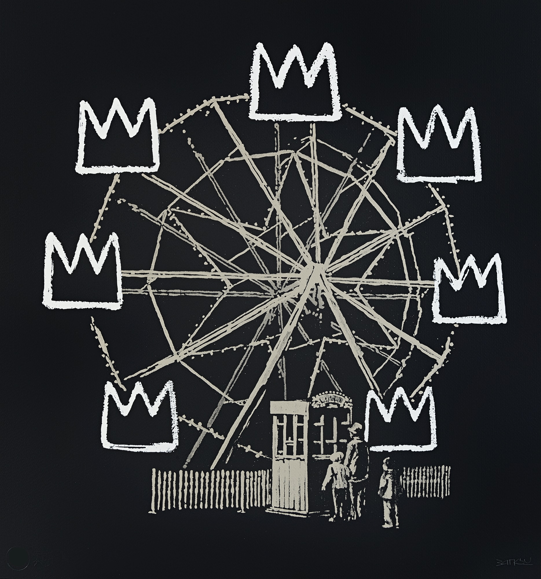In deze hommage aan Basquiat biedt Banksy een spiegel voor zijn eigen praktijk van toe-eigening en die van het eindeloze wiel van kapitalisme en consumentisme waarin meesterwerken massaal worden gereproduceerd op tee shirts of opnieuw worden gebruikt voor reclamecampagnes.Banksquiat toont een reuzenrad waarin alle wagons zijn vervangen door Basquiat’s beroemde kroonmotief. Door zo openlijk naar Basquiat te verwijzen, lijkt Banksy zich aan te sluiten bij de traditie van straatkunst als hoge kunst, die aantoonbaar zijn oorsprong vindt in het werk van Basquiat, wiens carrière werd gelanceerd door zijn vele interventies in de stedelijke omgeving. Banksy verwijst verder naar de straatkunstgeschiedenis door ervoor te kiezen zijn ontwerp in grijs af te drukken met de kronen in krijtwit op een zwarte ondergrond. Dit verwijst duidelijk naar een ander icoon van de straat, Keith Haring, die zijn carrière begon met een serie metrotekeningen, weergegeven met krijt op lege reclamepanelen in het New Yorkse metrosysteem.Banksquiat becommentarieert de excessen van het late kapitalisme dat toestaat dat kunstwerken worden gecommodificeerd. Tegelijkertijd is er een paradox in het spel; om kunst toegankelijk te maken voor iedereen – wat misschien wel centraal staat in Banksy’s missie als kunstenaar, net als die van Haring en zelfs Basquiat – moet kunst gereproduceerd en gedeeld worden in plaats van gegijzeld worden door een handjevol elites die het originele kunstwerk of het intellectuele eigendom bezitten. Op deze manier geeft Banksy slim commentaar op, zoals de oorspronkelijke websitebeschrijving het verwoordt, “de meedogenloze commodificatie van Basquiat in de afgelopen tijd – door op botte wijze toe te voegen aan de meedogenloze commodificatie van Basquiat in de afgelopen tijd”.Bron: https://banksyexplained.com/banksquiat-2019/