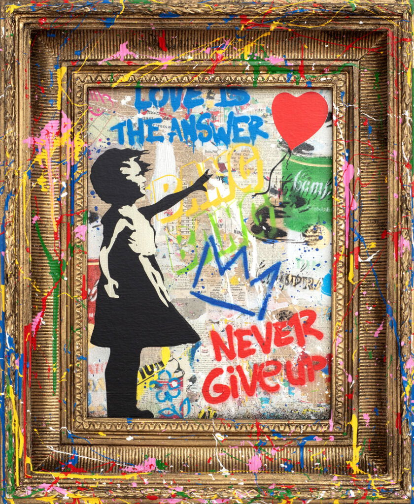 Mr. Brainwash – Artist Within Mr. Brainwash – Artist Within is een krachtig kunstwerk vol emotie, kleur en onverwachte symboliek. Op de voorgrond staat een jong meisje, met de rug licht gedraaid en een verfkwast in de hand. Voor haar prijkt de rode tekst I Love You, expressief en druipend op de muur gezet. Het contrast is opvallend. Het meisje, ogenschijnlijk onschuldig en ingetogen, wordt hier neergezet als de maker van een krachtige boodschap. Dit dualisme tussen kinderlijke puurheid en volwassen daadkracht versterkt de impact van het beeld. De achtergrond is een explosie van kleuren, graffiti en iconische beelden. Campbell’s soepblikken, krantenprints en gele Caution-teksten vullen de compositie. Deze lagen creëren een speelse maar gelaagde context waarin de boodschap van liefde en zelfexpressie centraal staat. Het gebruik van felle kleuren, gecombineerd met scherpe contrasten, zorgt voor een dynamisch en energiek geheel. Het werk laat zien dat kunst niet gebonden is aan leeftijd, en dat creativiteit in iedereen schuilt. De verfkwast in de hand van het meisje wordt zo een symbool van vrijheid en expressie. Artist Within is meer dan een visueel statement. Het is een herinnering dat de kunstenaar in ons allen aanwezig is. Het benadrukt dat het uiten van emoties – liefde, hoop en verlangen – altijd waardevol en krachtig blijft. Dit kunstwerk toont de typische stijl van Mr. Brainwash: een mix van humor, street art en optimisme. Door middel van herkenbare iconen en positieve slogans laat hij zien dat kunst toegankelijk is voor iedereen.